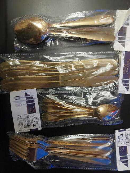 Sprzedam komplet sztućców 24 szt. ze stali nierdzewnej, kolor złoty. bez walizki. 6-szt. łyżki duże, 6-szt. widelce, ...