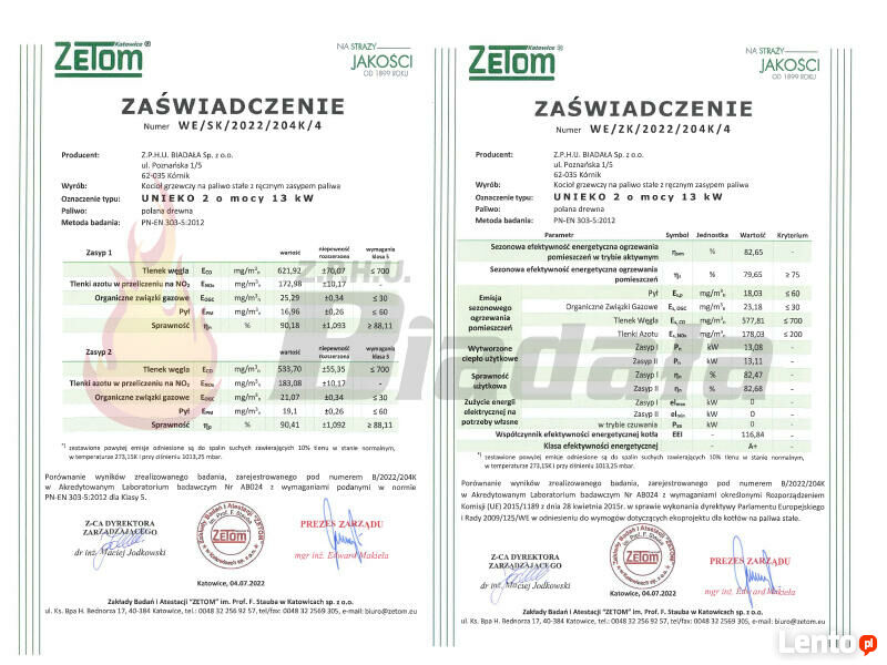Kocioł grzewczy Unieko 2 to najnowszy wyrób i jeden z nielicznych w Polsce bez podajnika z dużym paleniskiem spełniający wysokie wymagania normy PN-EN 303-5:2012 dla 5 klasy, oraz programów ochrony środowiska Ecodesign. Żeby spełniał tę klasę należy zamontować w instalacji zbiornik buforowy o minimalnej pojemności 690 litrów.