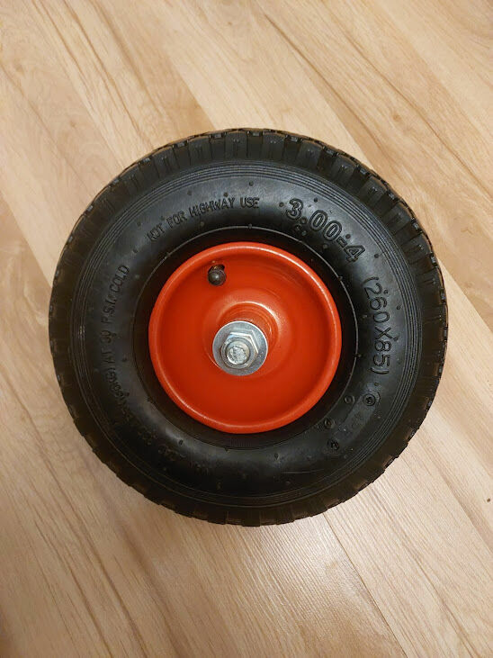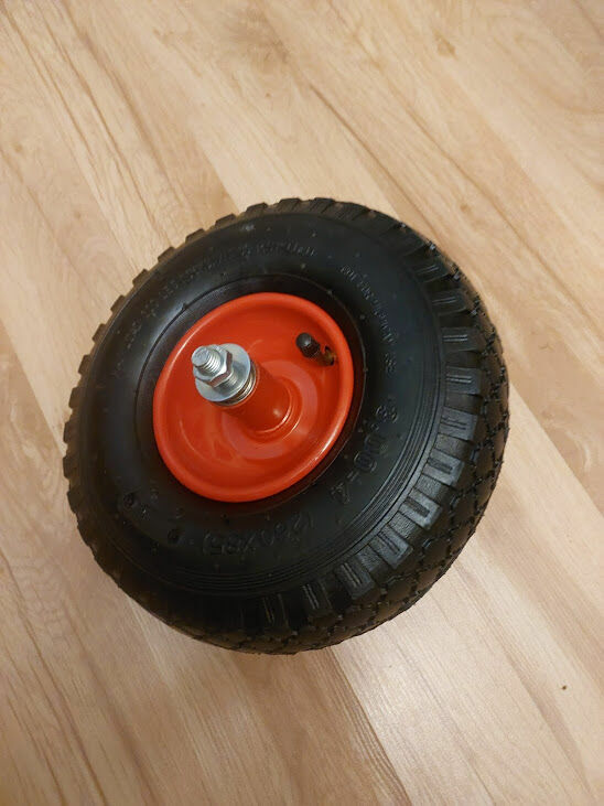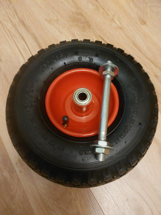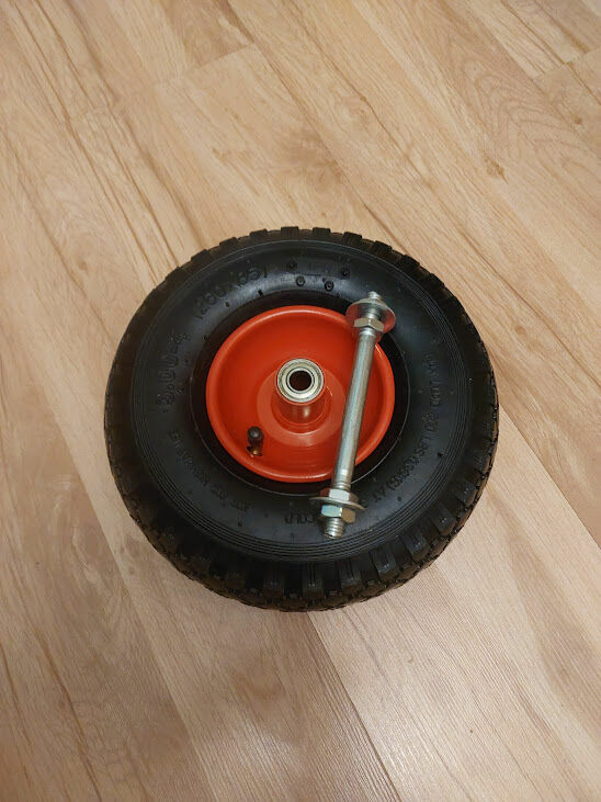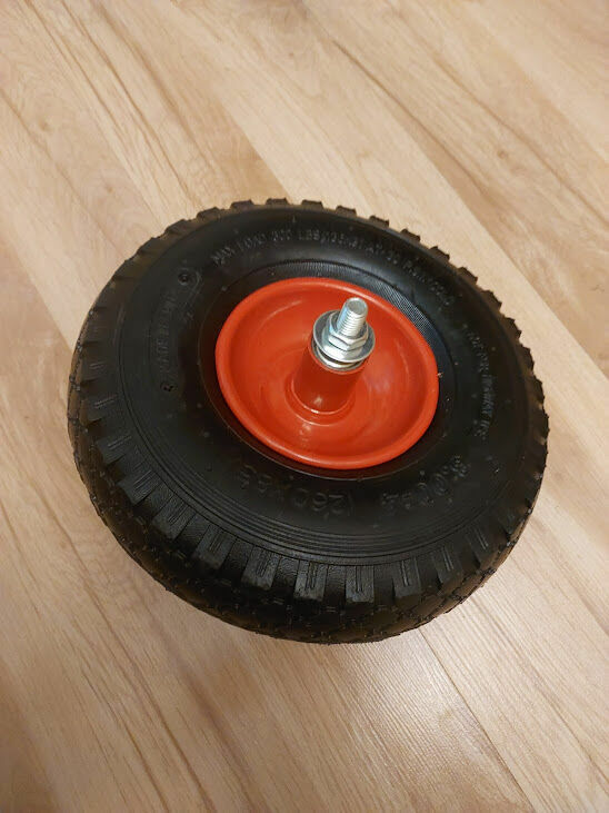 Sprzedam kółko pneumatyczne, pompowane wraz z ośką. Posiada bardzo mocną stalową felgę z rantem . W feldze są już zamontowane dwa łożyska.Opona z detką. Rozmiar 260 x 86 mm. Zastosowanie do dużych obciążeń np: do taczki, wózka transportowego itp. Dostepne 4 sztuki.