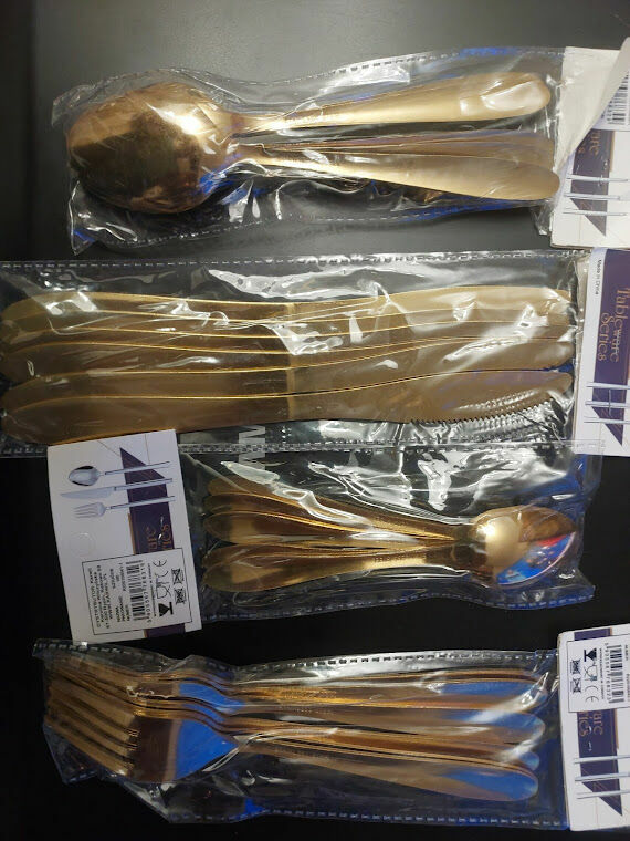 Sprzedam komplet sztućców 6 łyżek, 6 widelcy, 6 noży, 6 małych łyżeczek. w cenie łyżki 6 x 2,6 pln , widelce 6 x 2,6 pln., noże 6 x 2,6 pln., łyżeczek 6 x 2 pln. Ze stali nierdzewnej. W kolorze złotym.Komplet bez opakowania walizkowego. Nowy w opakowaniu fabrycznym.