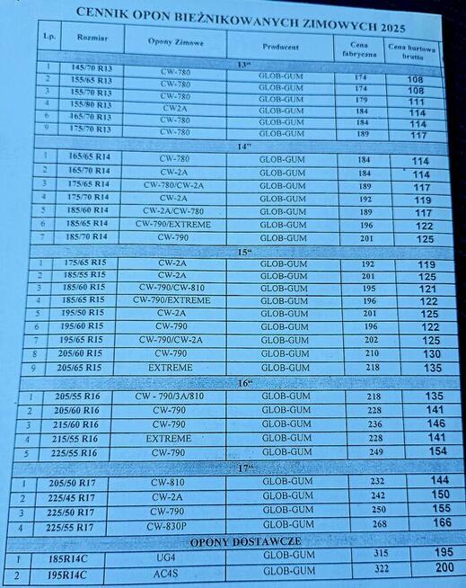 Posiadam w sprzedaży opony bieżnikowane, różne rozmiary jak na załączonym zdjęciu.