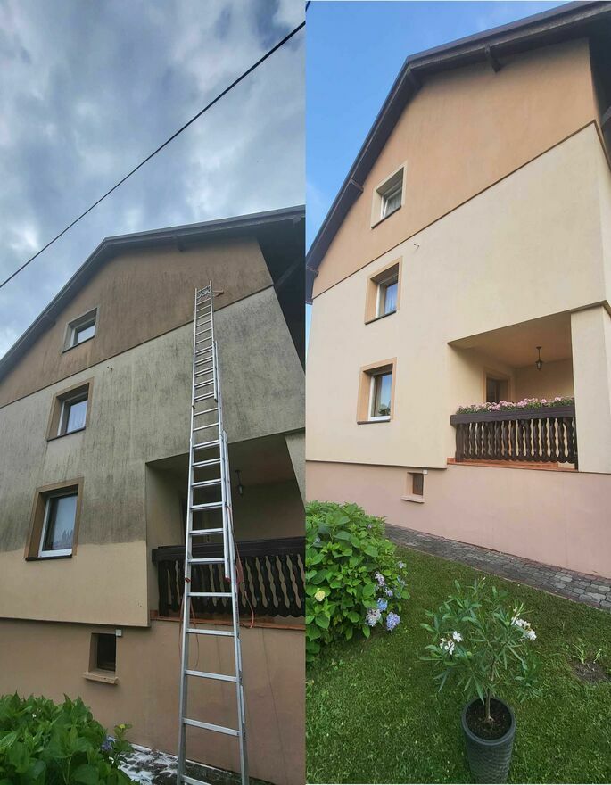 Oferuję mycie ciśnieniowe lub chemiczne elewacji, które skutecznie usuwa zabrudzenia armosferyczne, mchy i porosty i zielone naloty np na północnej ścianie.